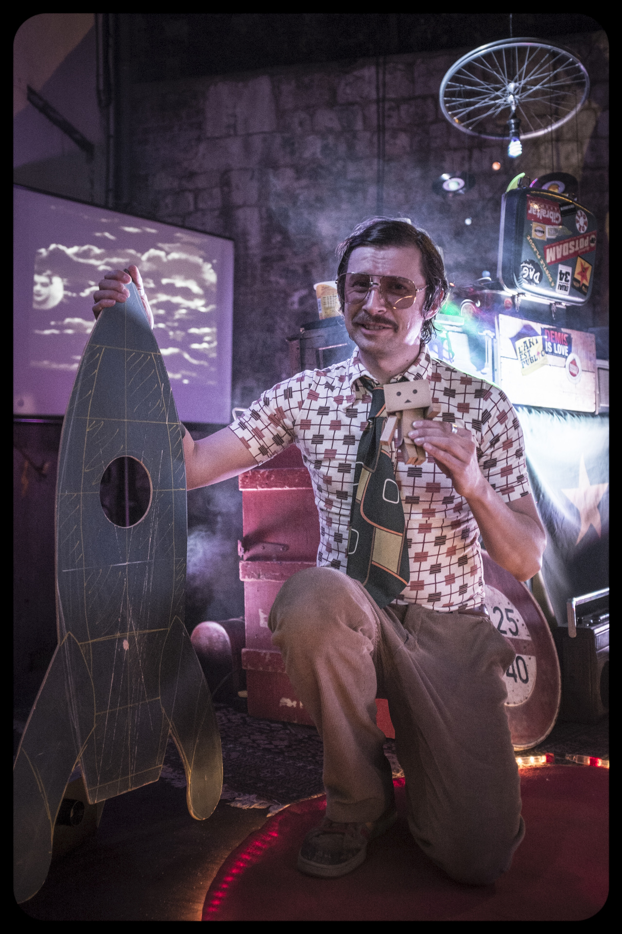 Vladimir Spoutnik, crooner anachronique à la naphtaline, avec son costume de velours côtelé, sa moustache et ses verres fumés, est un Disc-Jockey qui ne diffuse que des morceaux célestes, dédiés à la lune, aux étoiles, aux astres, au soleil, le tout dans un univers visuel rétro-bricolo et tout un décor constitué de vieilles caisses et de vieux objets.